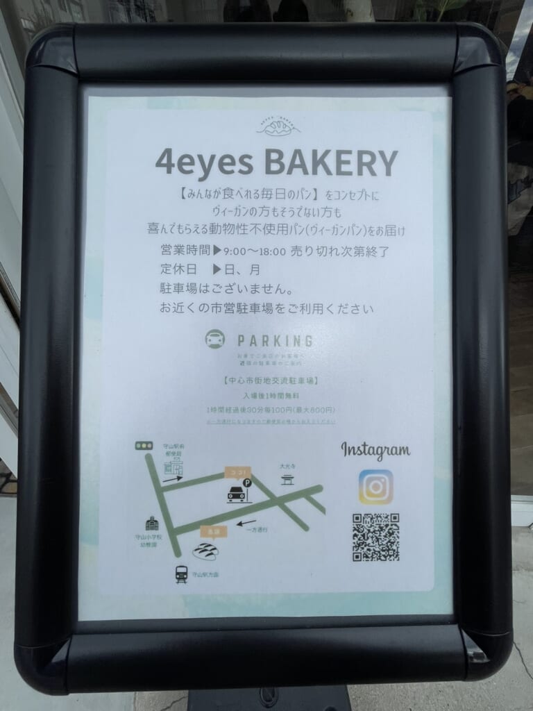 先日、今年9月にオープンした滋賀県守山市の4eyes BAKERYを訪問してきました。初めて行くお店は「どんなお店なのかな?」とワクワクしますね。伊藤シェフのお話しだと「アレルギーをお持ちの方や様々な食の選択をされている方など、どなたでも一緒にパンを食べて頂けるように肉・魚・卵・乳製品などの動物性食品を使用しないヴィーガンのパンを販売しています」との事でした。そして近くまで行くと、白い壁に大きく4eyes BAKERY(フォーアイズベーカリー)と書かれていたので、車で走っていてもすぐに分かりました。