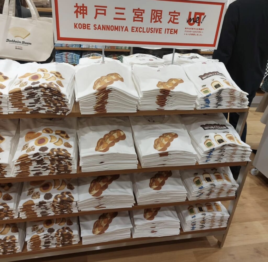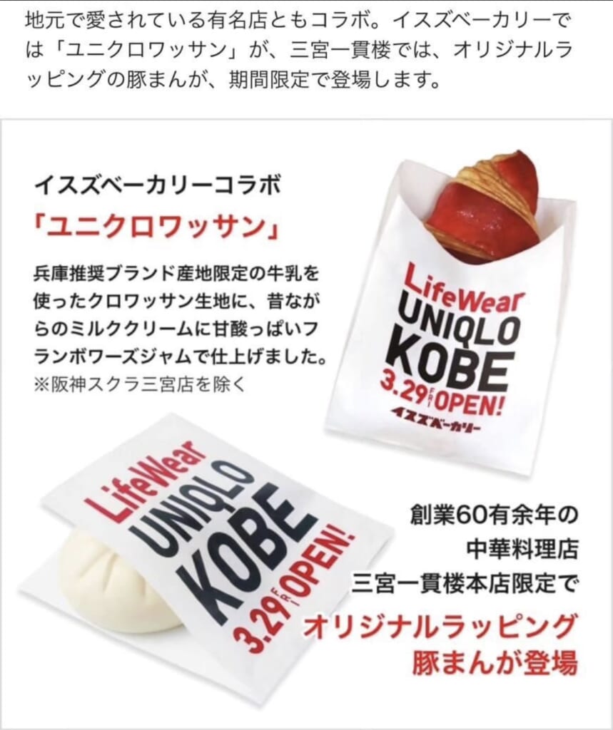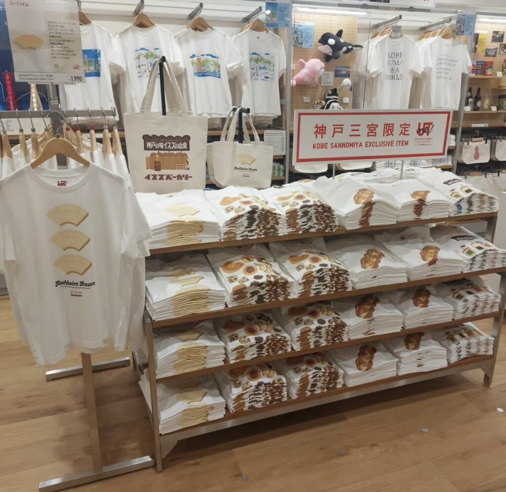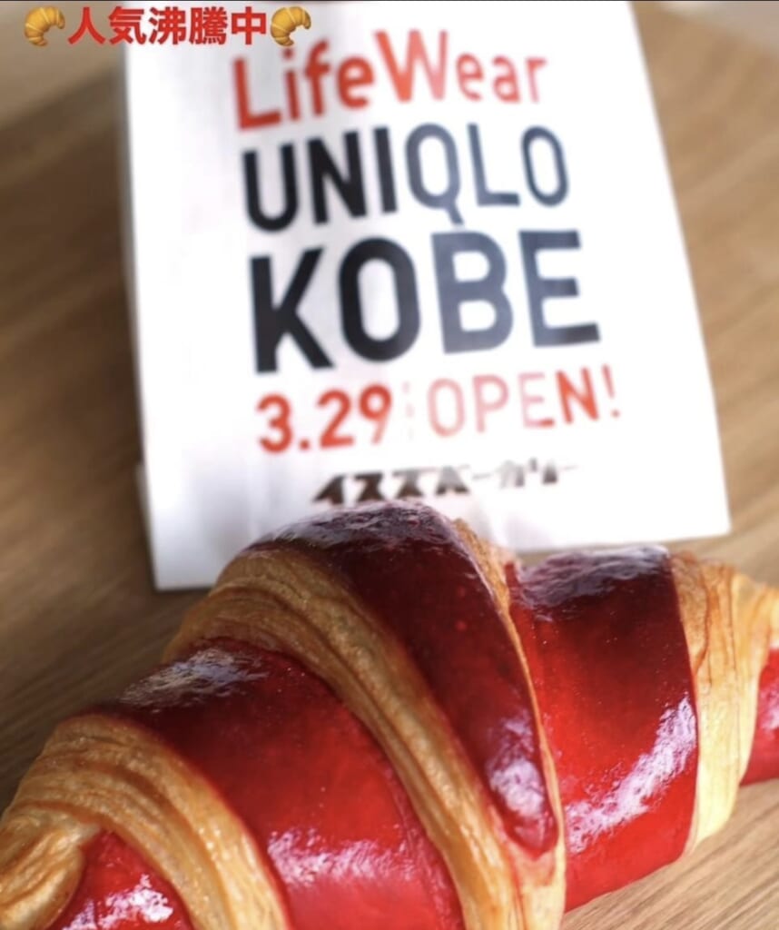 三宮に兵庫県最大!UNIQLO神戸三宮店がオープンした際、イスズベーカリーさんに声がかかりコラボ企画が実現しました!UNIQLO神戸三宮店では、三宮店限定UTとしてイスズベーカリーのTシャツが販売され、イスズベーカリーでは、UNIQLOコラボのクロワッサン、その名も「ユニクロワッサン」が販売されました。