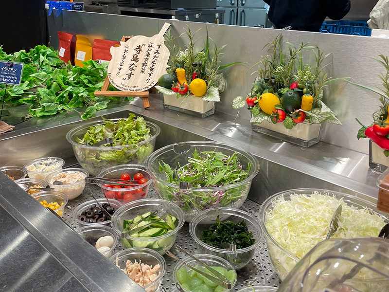 サラダとドレッシングが豊富にあり、そのディスプレイがお洒落なので、その前に立つだけでワクワクします。