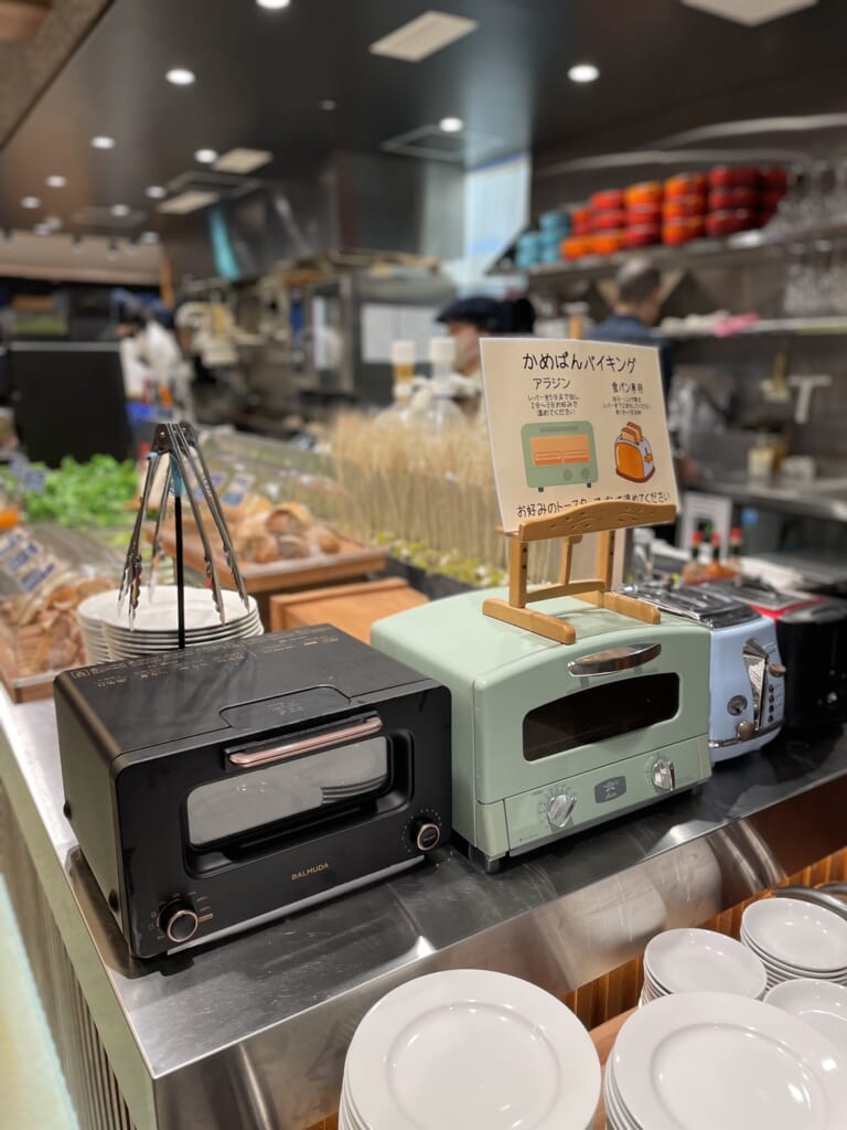 目の前の「かめぱん」から提供されるので焼きたてが途切れることなく提供されます。またいろんなスタイルのトースターが用意されているので、温かいパンが食べられます。