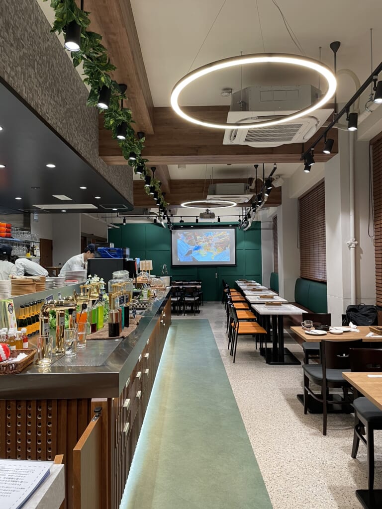 店内に設置された大画面モニターには、パン作りの様子などが流れています。それも楽しめますが、グループでの利用なら、オリジナル映像を流すこともできるそうです。また、基本はオープンなスタイルの席配置ですが、個室もあるので小さな子供さん連れの家族でも楽しめますね。