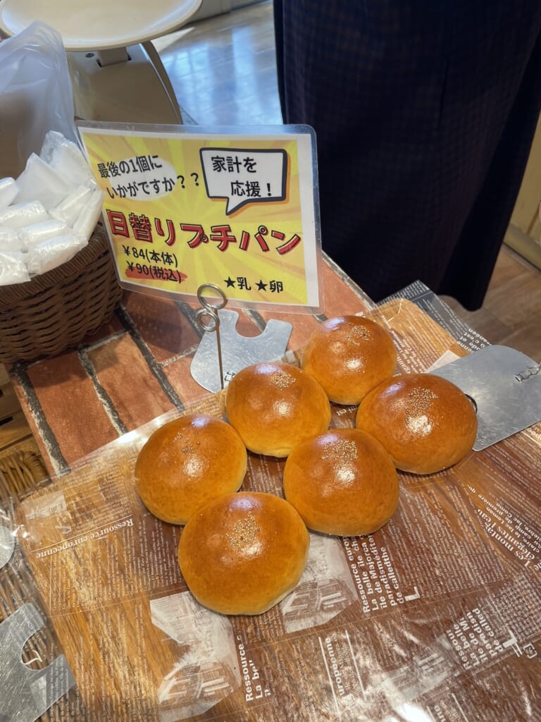 「最後の1個にいかがですか?家計を応援!日替りプチパン(税込90円)」