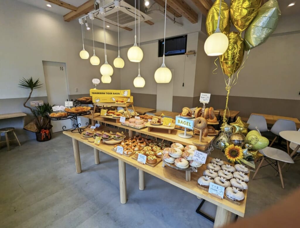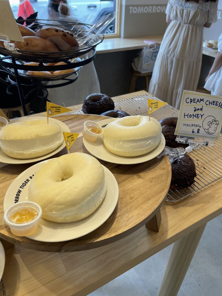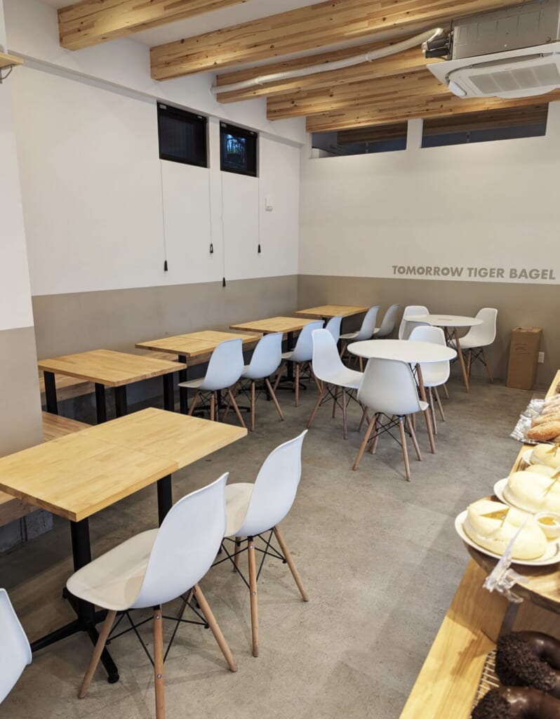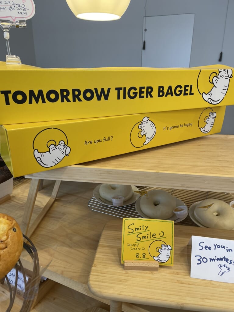 実は、こちらも大阪老舗ベーカリーがプロデュースするベーグル専門店なんです。鶴橋と言えば、焼肉の街とともに、今やコリアンタウンとして有名です。そして昔は韓国食材が中心だったのが、今は韓流映画や韓流ミュージックのグッズやコスメなどを求めた、10代や20代の女性の街になっています。なのでTOMORROW TIGER BAGELは若い女性を対象とした店作りをされています。店内も「映え」を意識したディスプレイになっていて、思わず写真を撮りたくなりますね。