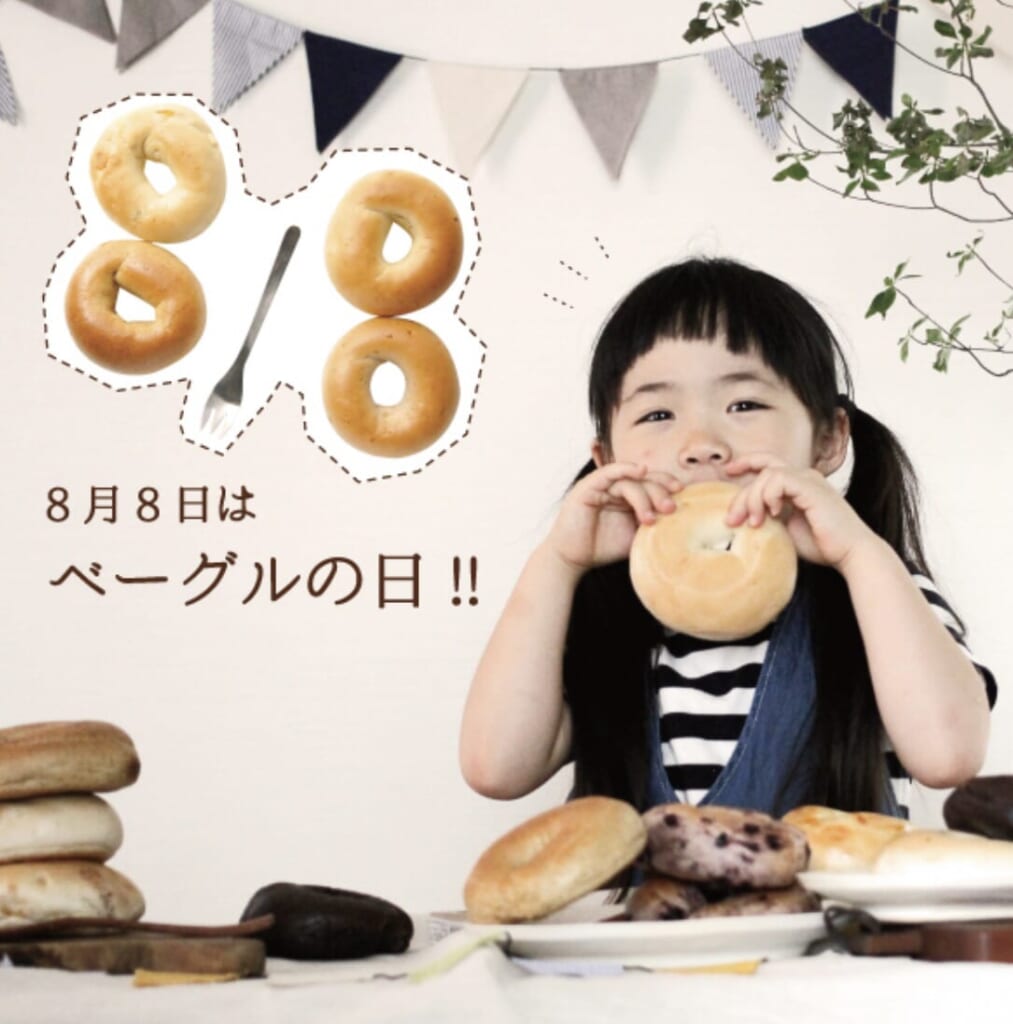 おそらくベーグルの輪を2つ合わせて8とする。形的なものなのでしょうね。パンの日は4月12日、あんぱんの日は4月4日、フランスパンの日は11月28日など、春や秋には記念日があるのですが、夏にパンの記念日があるとは知りませんでした。8月8日!パン屋にとって、夏の厳しい季節にベーグルでイベントもいいのではないでしょうか。