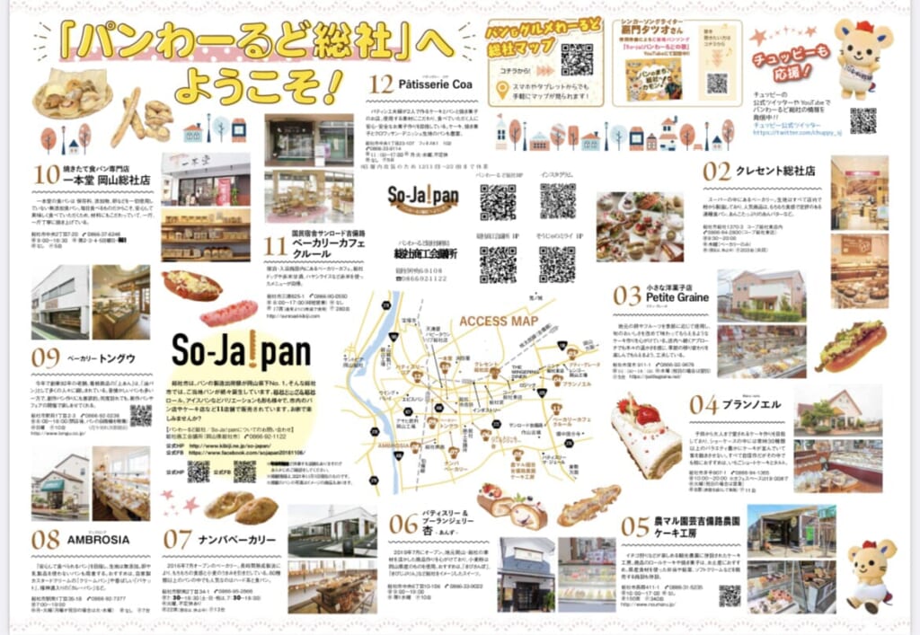 その取り組みが「パンわーるど総社」「So-Ja!pan」(商工会議所が支援)です!マーケティング的には同じ地域に同業店があるとお客さまの食い合いをしてしまいマイナスのイメージですが、そもそも地方の場合は、地域だけではなく他エリアから人を呼んでこないといけない状況が多いです。そう考えると同業店が団結して、魅力ある町として発信し、他エリアから人を呼んでくるのは、特徴的な取り組みだと思います。