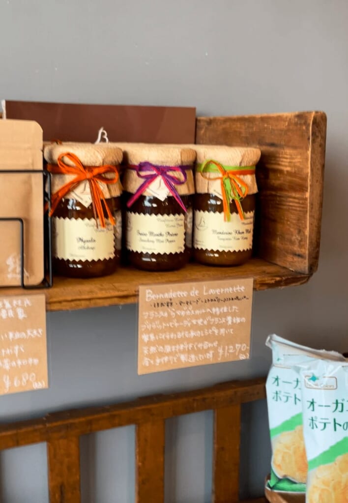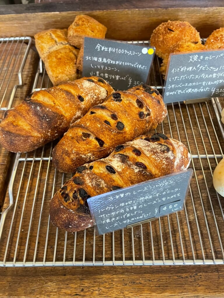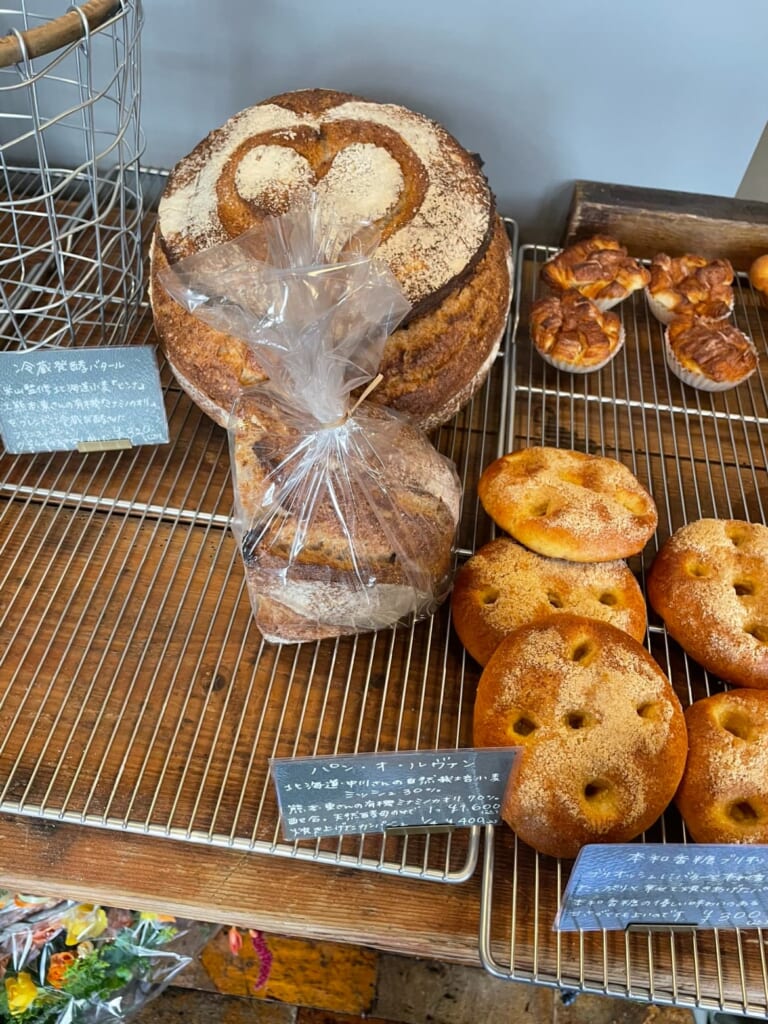 パンに使う国産小麦3種類のうち2種類は店内の臼で挽いた物を使い、商品は、北海道自然栽培小麦使用パン・オ・ルヴァン(1/4カット400円)の他、角食パン(1斤=410円)、冷凍発酵バゲット(1本=320円)、塩麹カントリーブレッド(1/2本=410円)など、こだわりのパンが並びます。