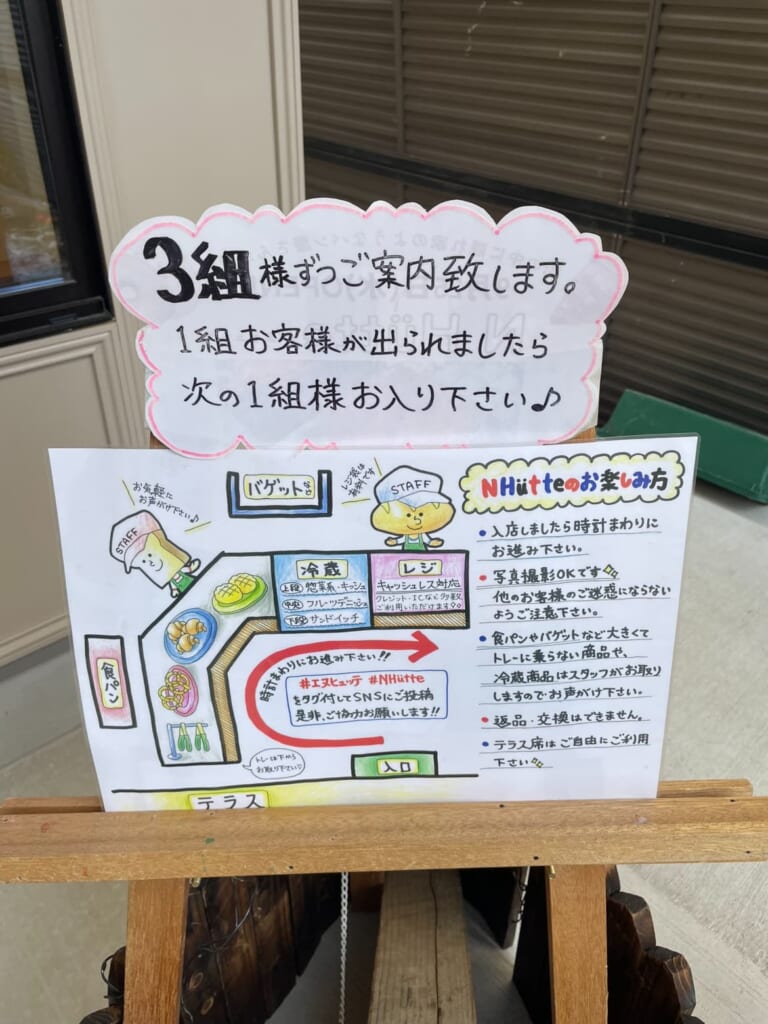 その列の上には、ちゃんとひさし(屋根)があり雨の日は助かるだろうなぁと優しさを感じました。そして入口前には手書きの可愛い「店内見取図」があり、そこには「N Hütteの楽しみ方」とありました。「案内」とか「注意書」と書かずに、「楽しみ方」と書いてあるのがいいですね^o^