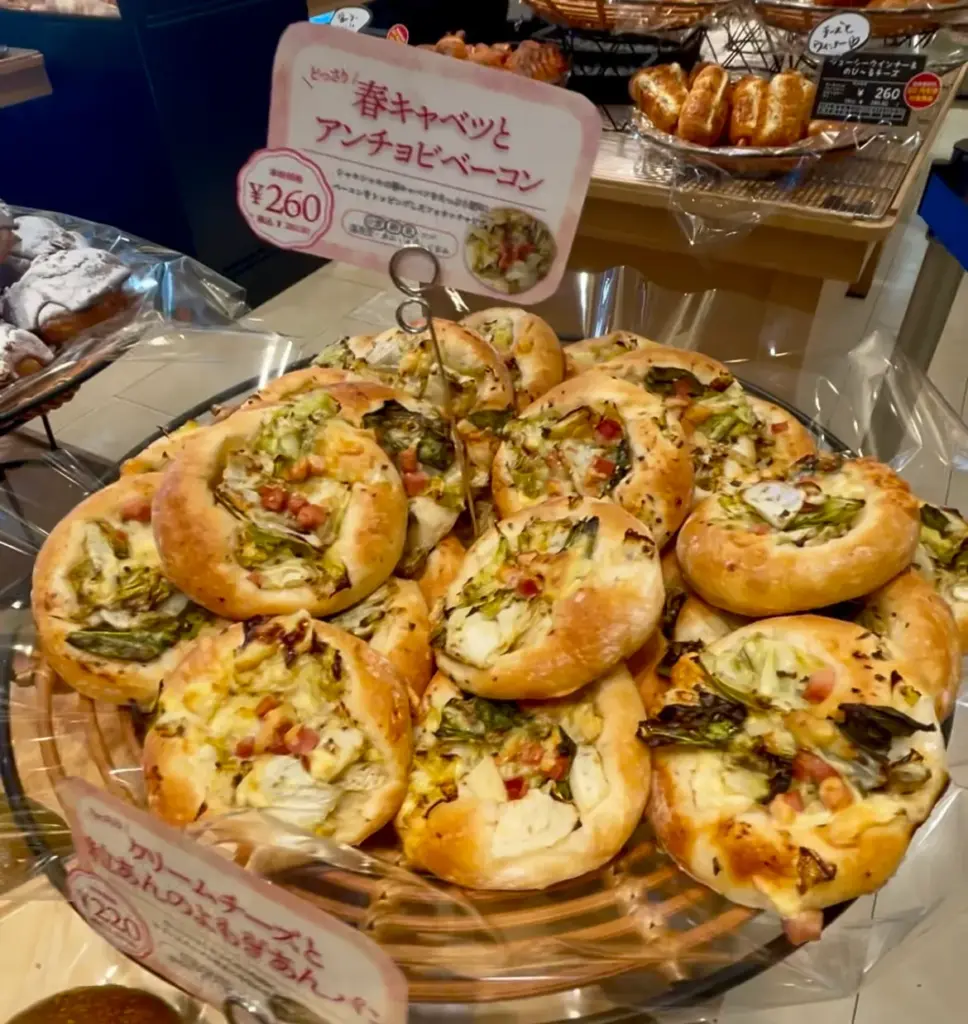 4月なら、「どっさり春キャベツとアンチョビベーコン」「もっちりクリームチーズと粒あんのよもぎあんパン」など。