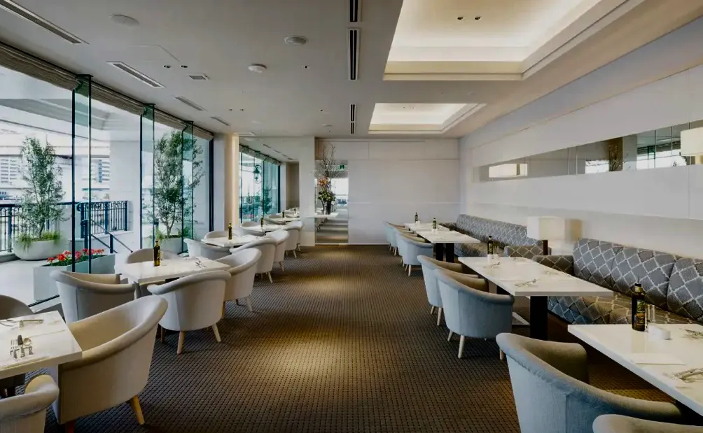 店内の西南側は全てガラス張りの窓になっていて、日中は太陽の光、夜は夜景を楽しめます。総料理長笠原シェフの華麗な料理を堪能できます。