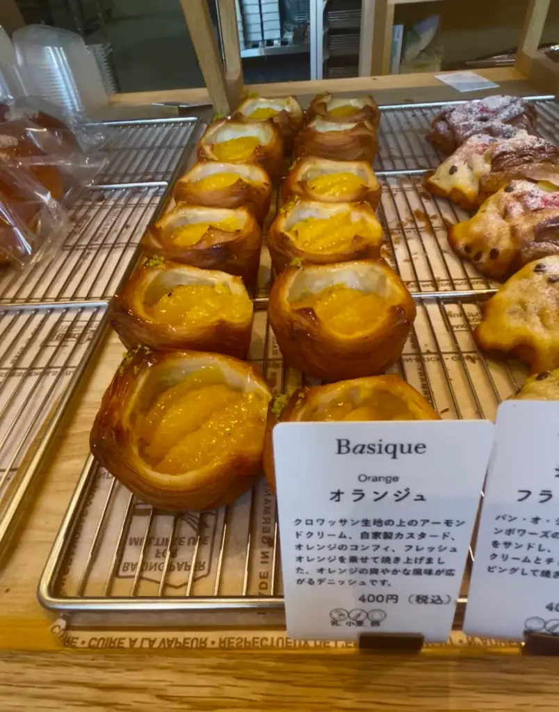 クロワッサン生地にアーモンドクリーム、自家製カスタード、オレンジコンフィ、フレッシュオレンジをのせて焼き上げています。