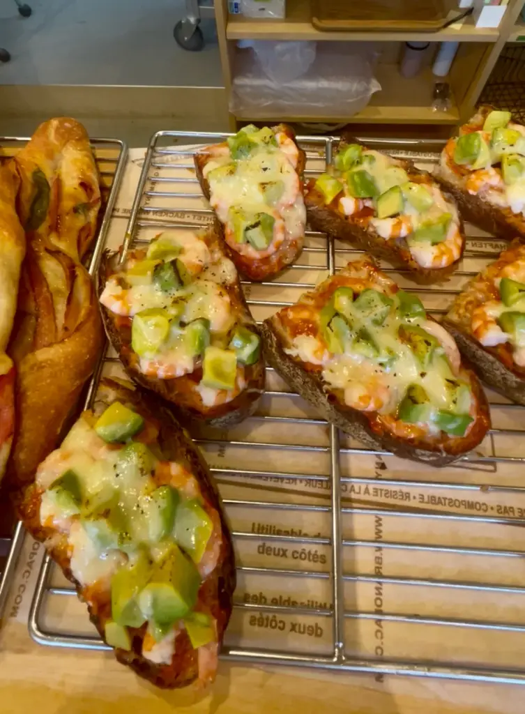 パンドカンパーニュの上に、トマトクリーム、えび、アボカド、チーズをのせて焼き上げています。