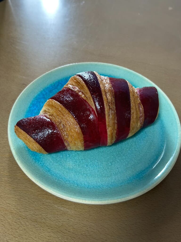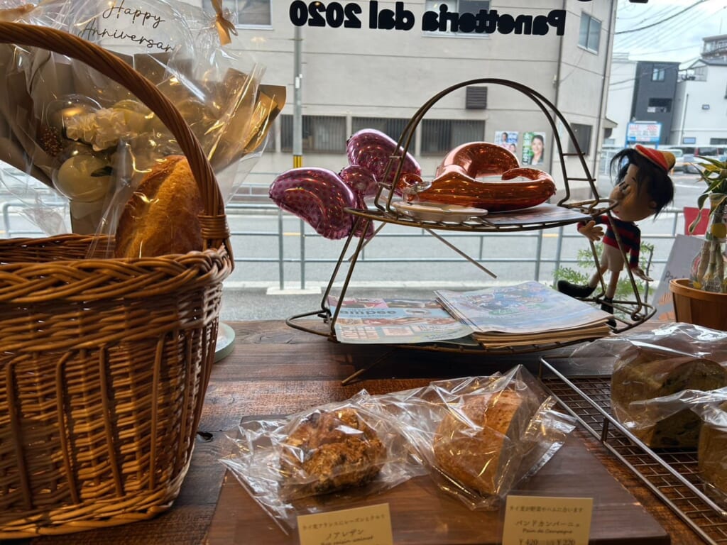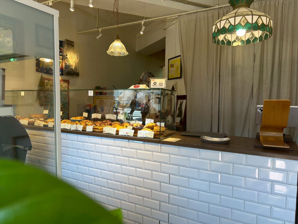 一歩店内に足を踏み入れると、壁に飾られた愛犬のイラストやサッカーのユニフォームが目に飛び込んできます 。まさに「シェフ夫妻の好きなもので溢れている」という言葉がぴったりの空間です 。パンを陳列しているお皿もおしゃれで、細部へのこだわりが感じられます 。また、販売を担当されている奥様はもちろん、厨房の中にいるシェフからもお客様への声掛けがよく聞こえてくるのが印象的でした 。
