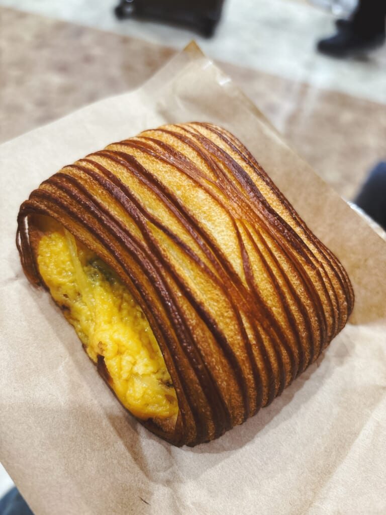 「パンスイスです」と答えると、「すぐに売り切れてしまう日が多いので良かったです」と教えてくださいました。 購入したパンスイスは生地がパリパリで、中の板チョコとカスタードのバランスがよく板チョコで甘すぎたりくどくなりすぎたりせずとっても良い塩梅でした!