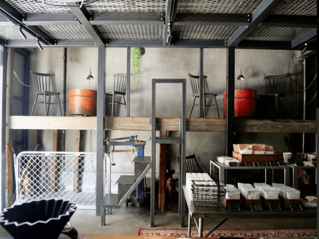 普通なら取り替えてしまう古い焙煎機やダクトを、“前のお店の歴史を語る一部”として残すのがポイント。